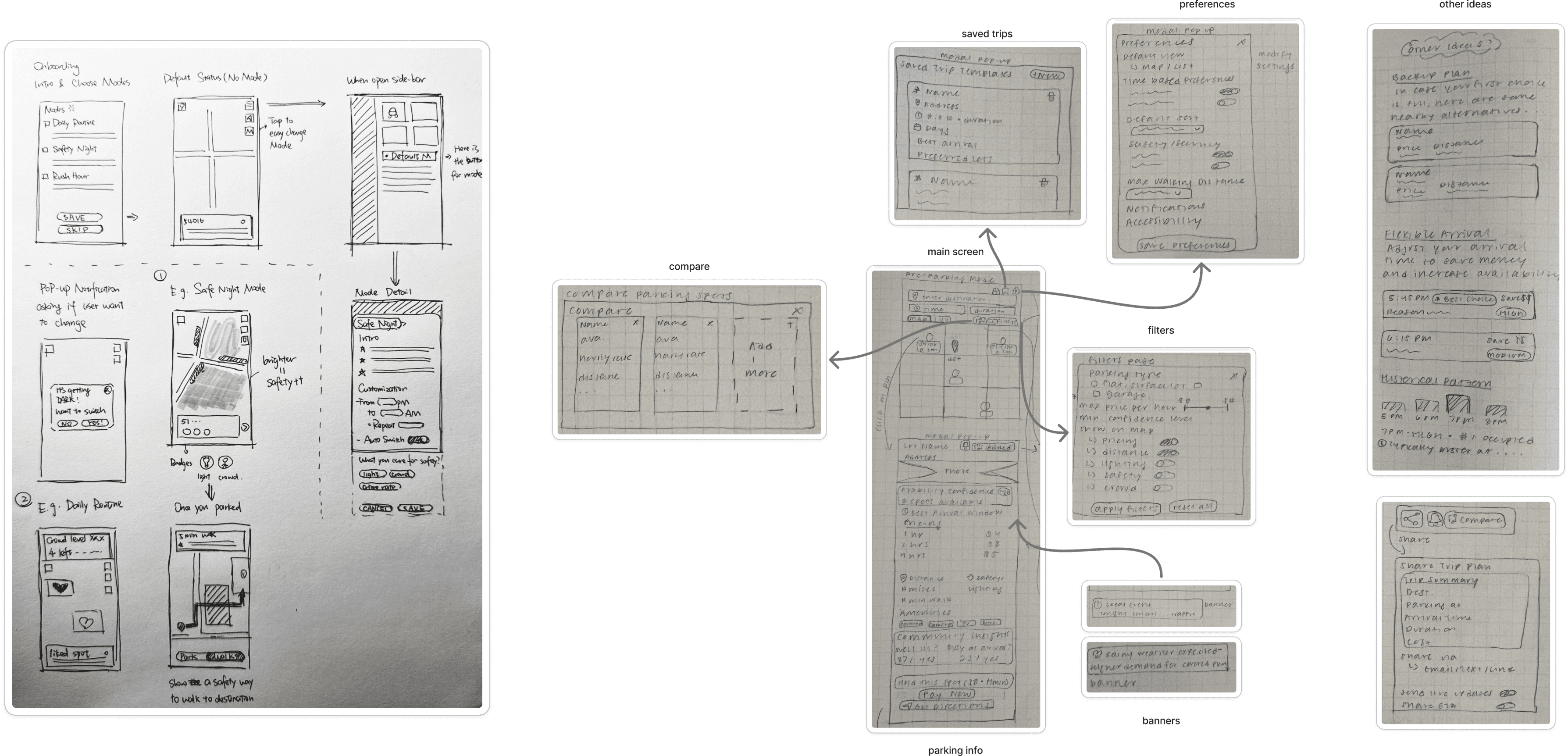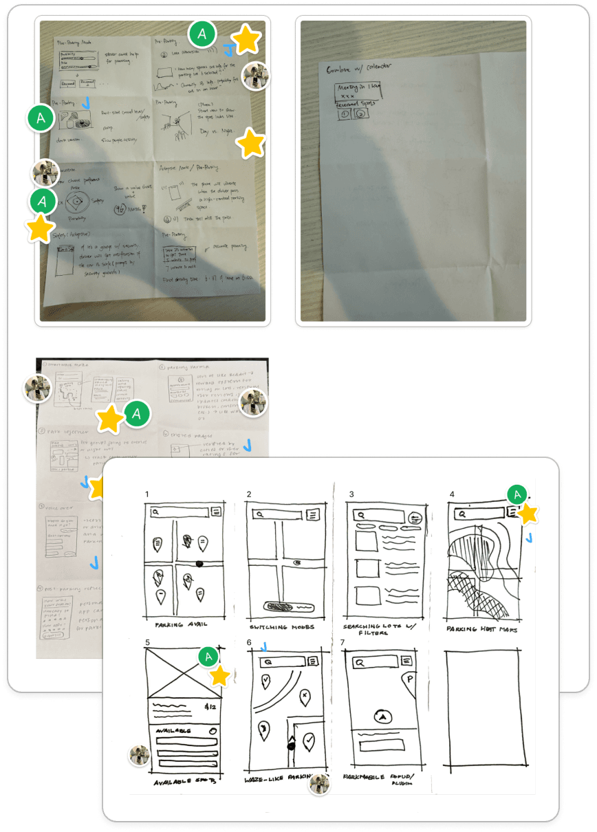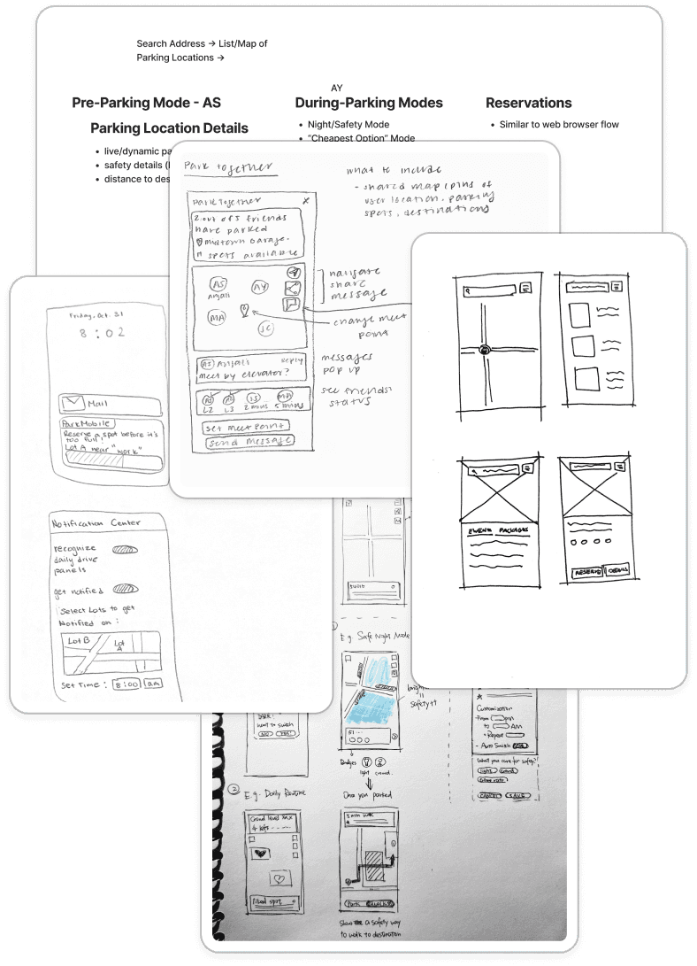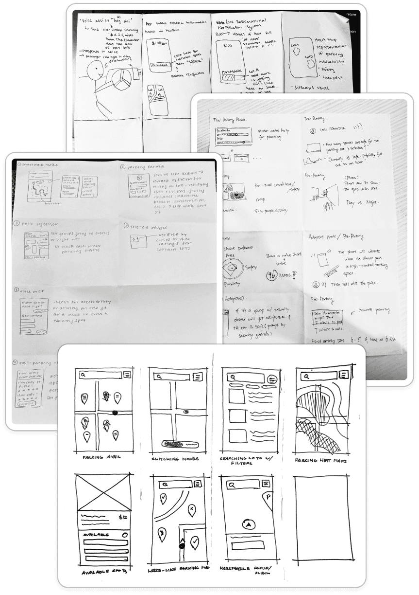 With our sketches, we explored ideas around three ideas - Pre-Parking Planning, Parking Companions, and Adaptive Parking Modes.