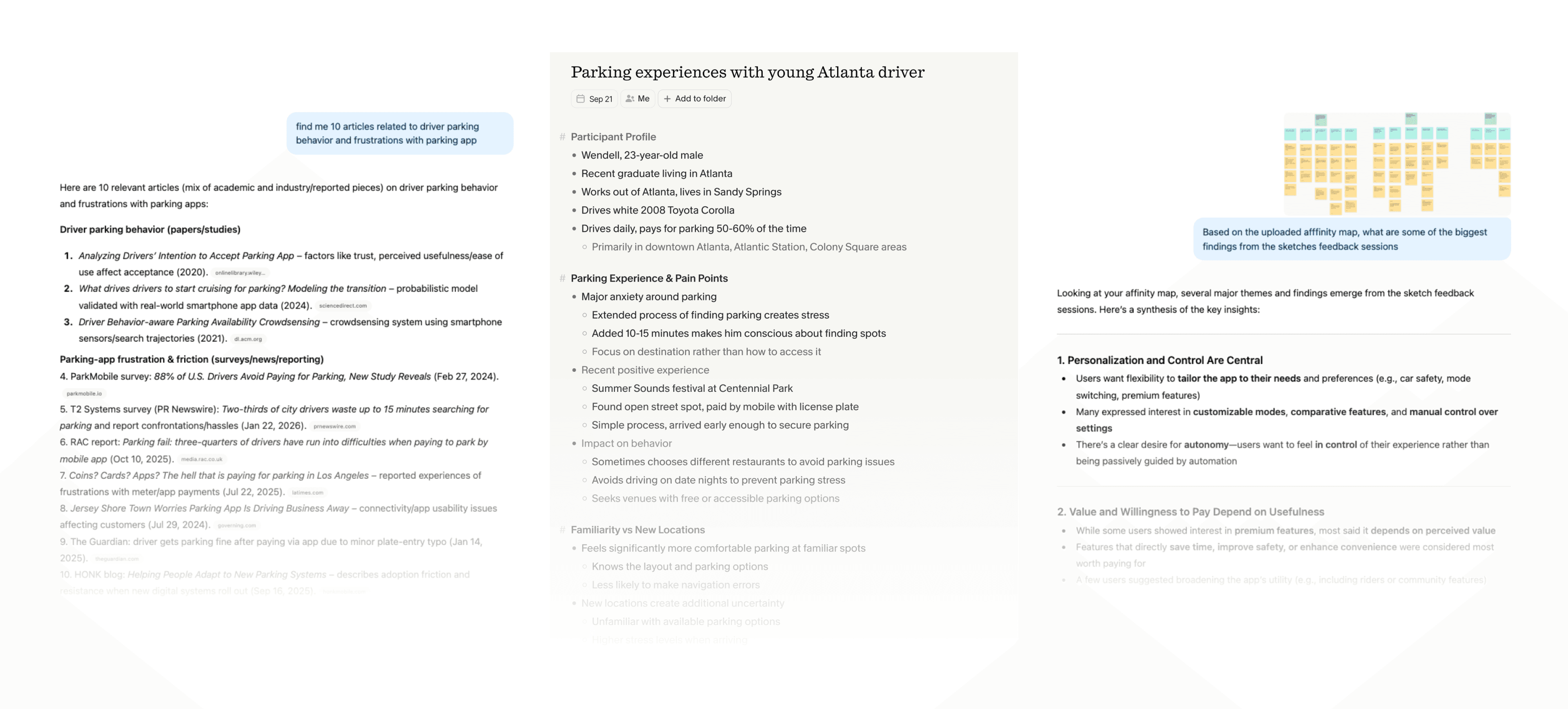 Throughout our user research process, we leveraged AI tools to act a second user researcher on the team. We used tools like Chat and Granola to supplement notes from user interviews, have agents review and pull up research articles, and analyze affinity maps.
