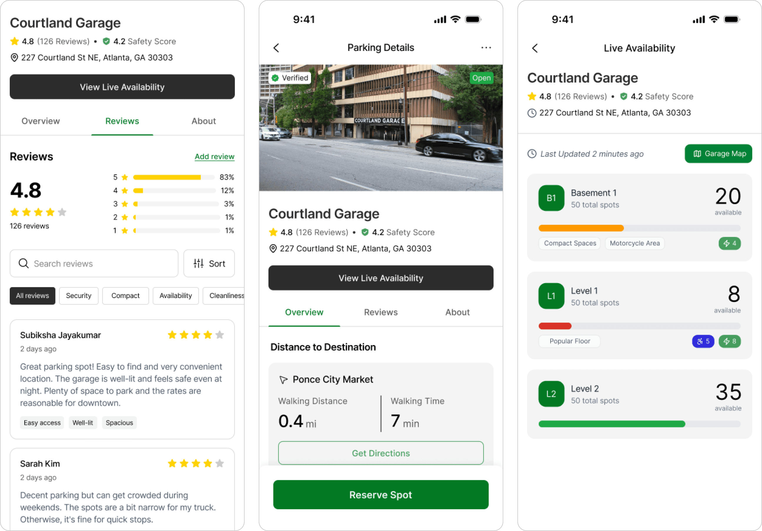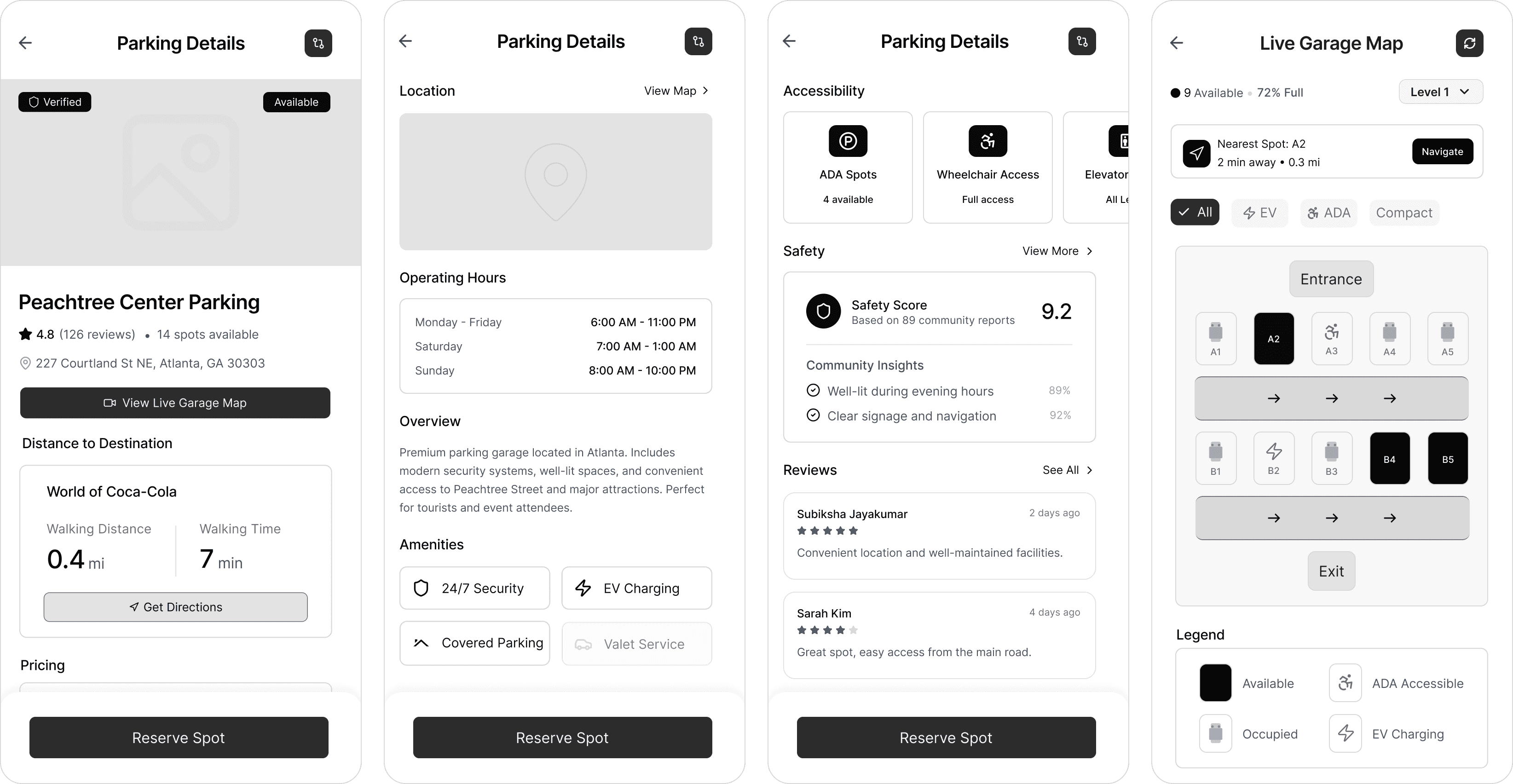 Drivers can receive additional information on parking such as reviews, safety, amenities, accessibility details, and spot availability.