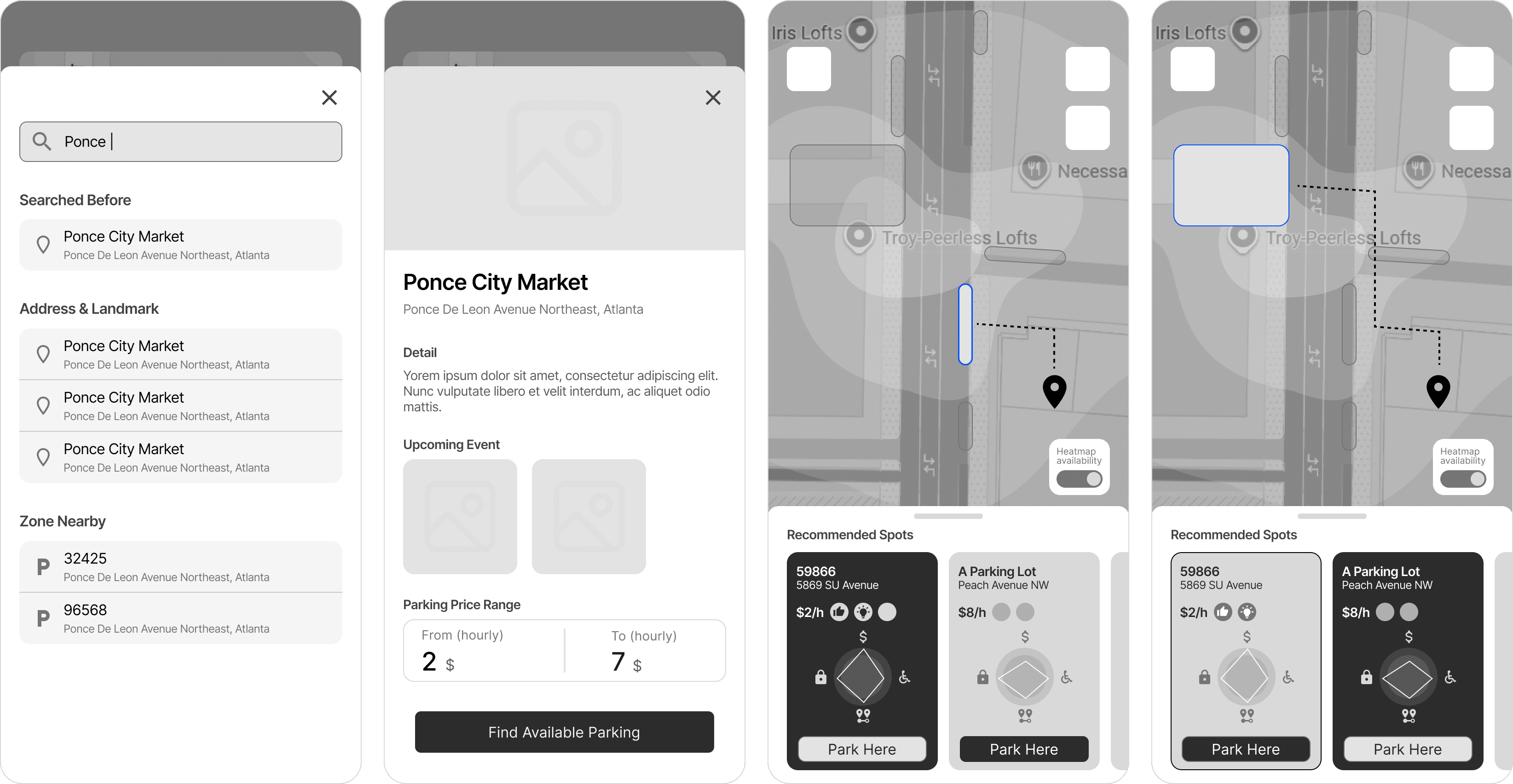 Initial wireframes for parking details and live garage availability focused on providing concise information about amenities, accessibility, and real-time garage availability to help drivers quickly evaluate parking options.
