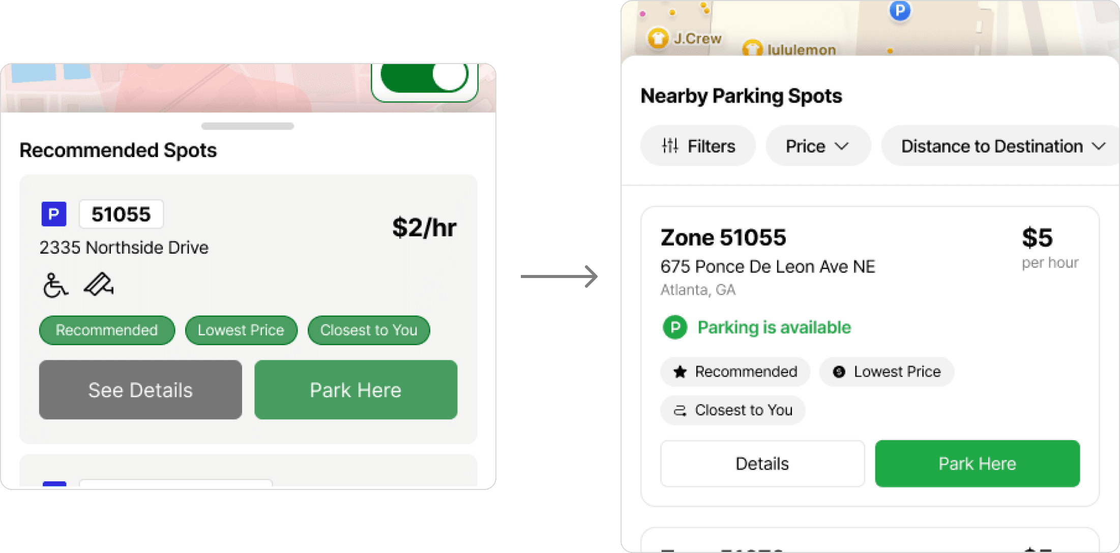 Users found the parking spider chart to be too difficult and complex to understand at first glance. Moving away from the chart, we redesigned the parking location card with a focus on scannability and simplicity.