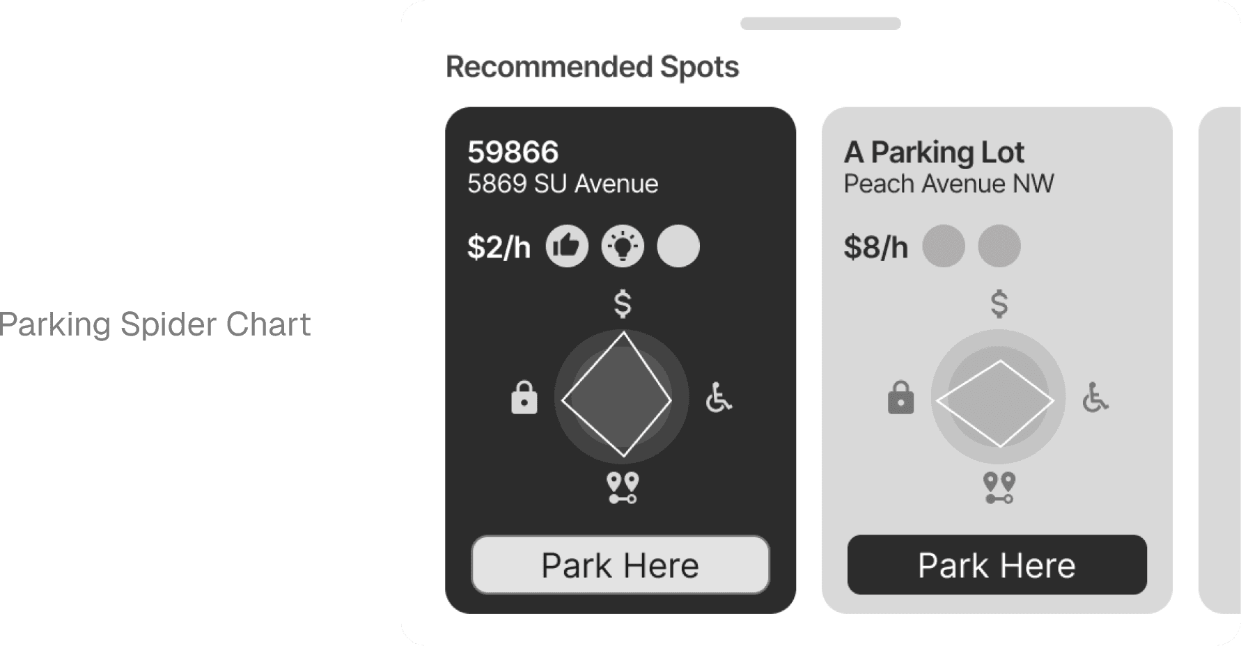 The parking heat map helps drivers quickly understand parking availability in a given area. To support deeper comparison, we also explored a Parking Spider Chart, allowing users to evaluate multiple parking options across key factors and quickly identify which spot best fits their needs.