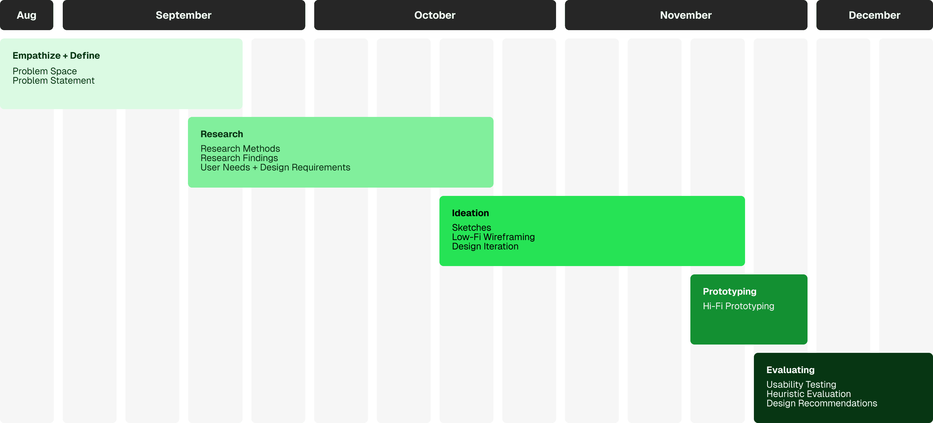 The group then scoped out the next 16 weeks for the project, breaking apart the project into phases - from Empathizing and Defining to Ideation and then on to Evaluation.