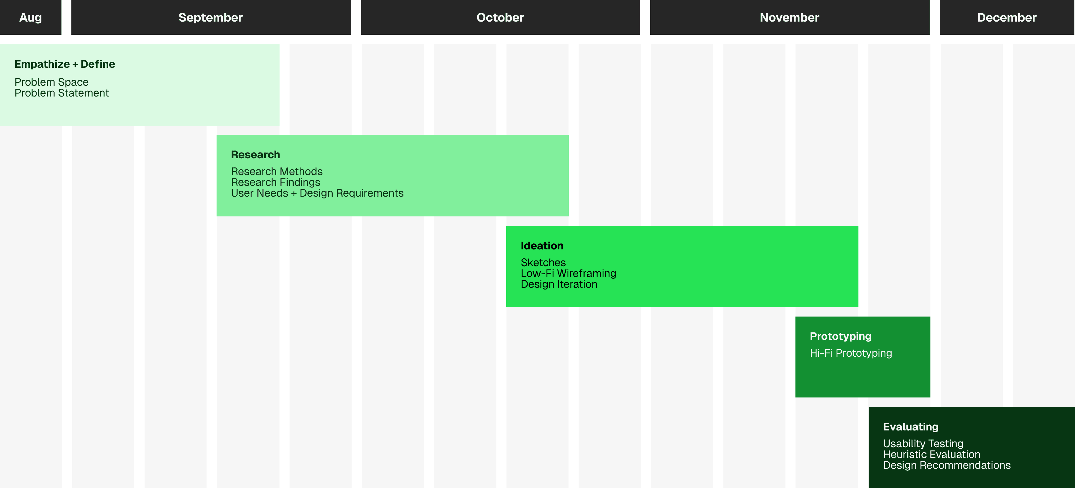 The group then scoped out the next 16 weeks for the project, breaking apart the project into phases - from Empathizing and Defining the problem space to Ideation and then on to Evaluation.