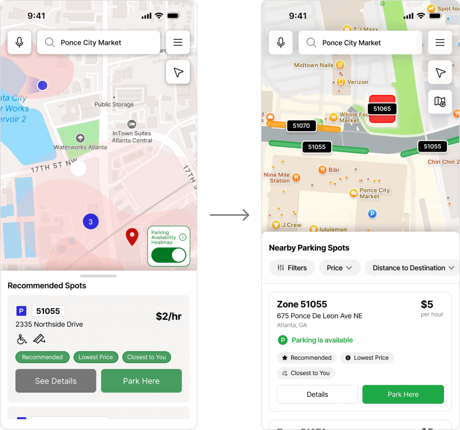 Users were still misinterpreting the heat map where they believed more red areas to be more parking congestion. As such, we completely moved away from the heat map and towards a simplified visual for parking availability, where now individual parking zones highlight how available parking is based on a green to red color scale.