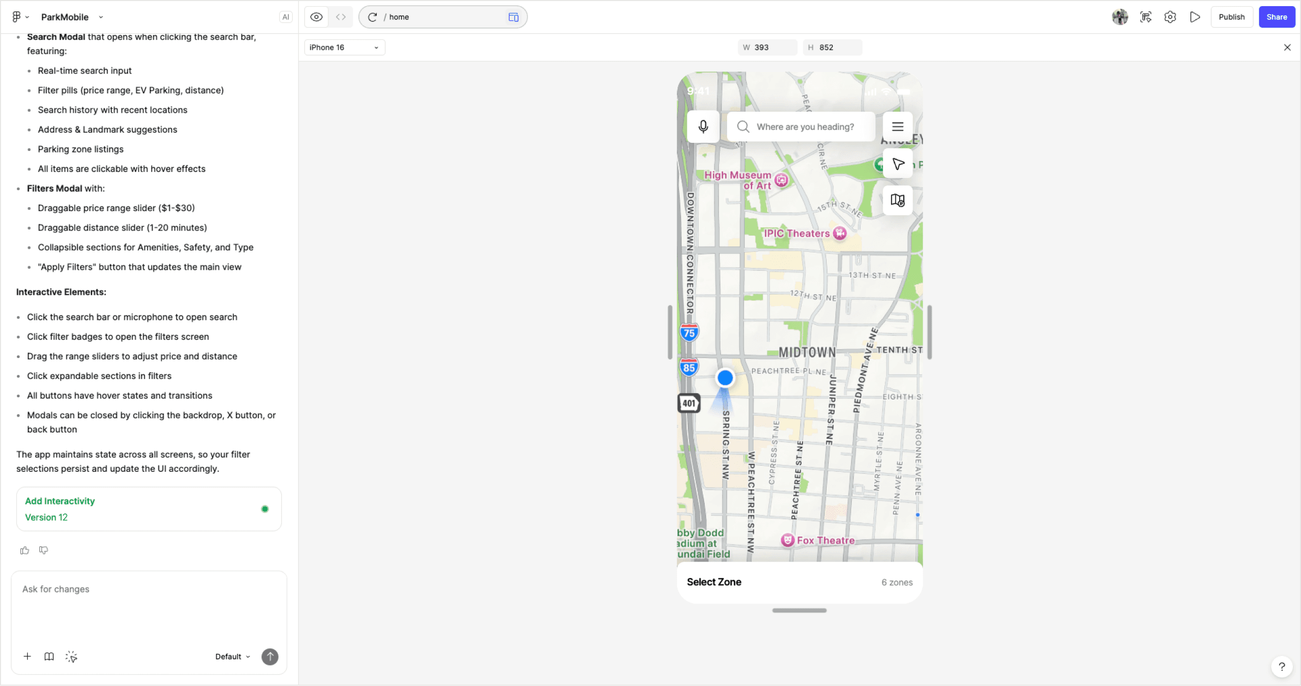 Throughout our prototyping process, we utilized AI design tools like Figma Make that allowed us to increased our speed and get prototypes the hands of users quicker. It also allowed us to add more complex interactions like map interactions - a task that would take much longer with manual prototyping.