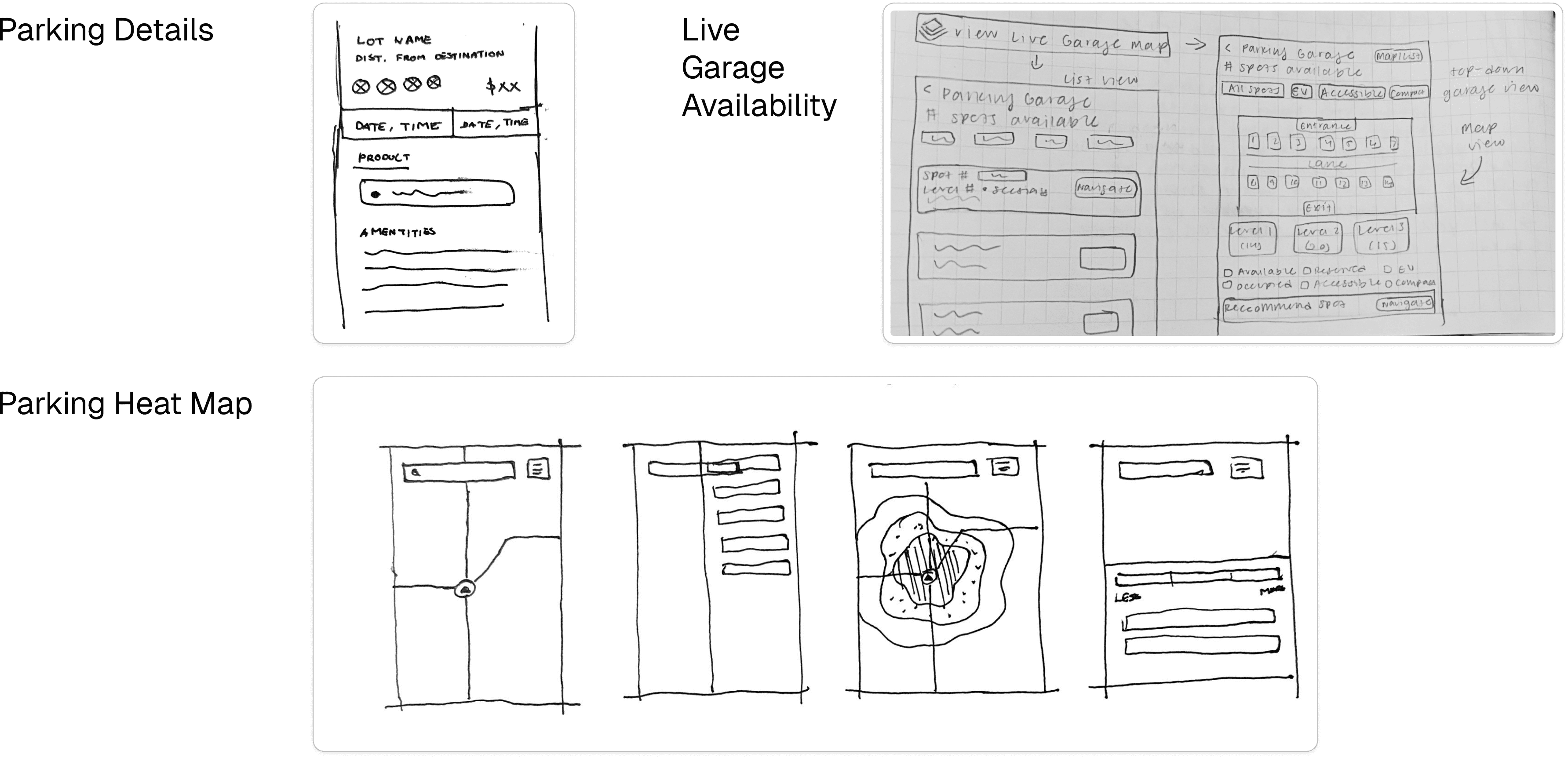 Sketches around Pre-Parking Planning explored how we might surface key parking information earlier in the driver journey, allowing users to plan before arriving at their destination. Features we explored included parking details, live garage availability, and a parking heat map.