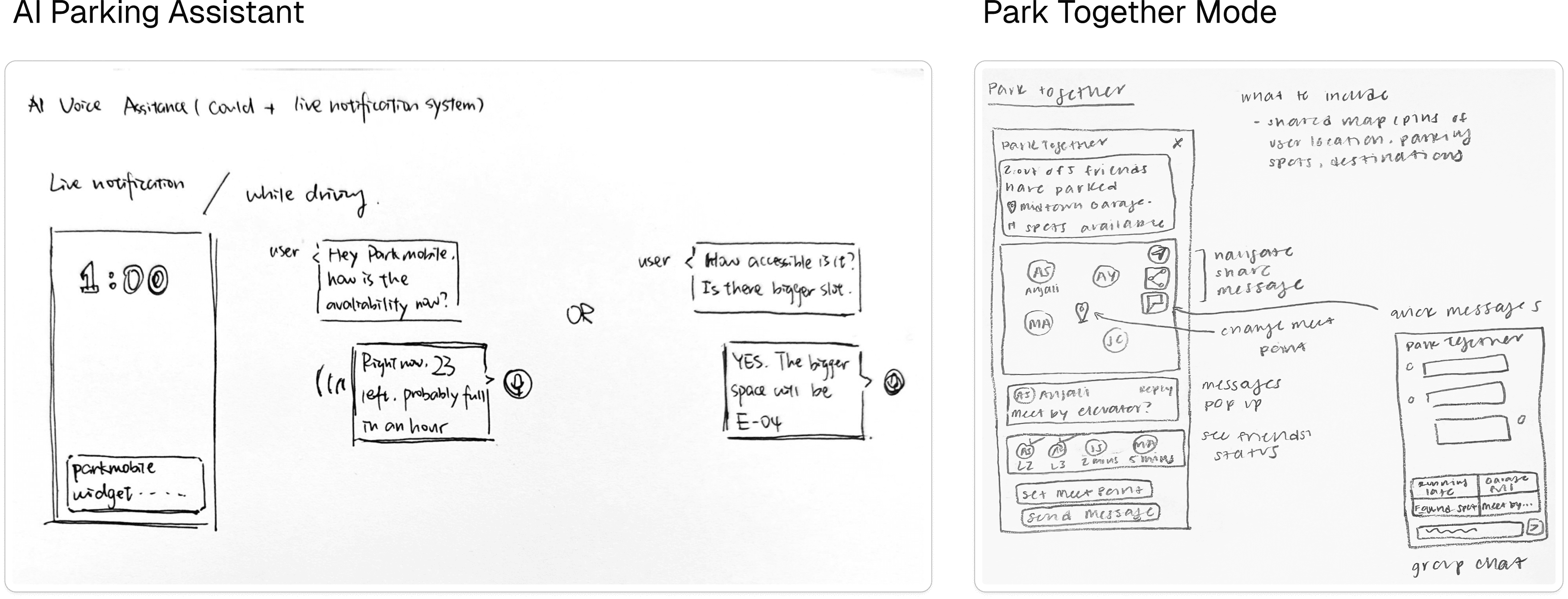 Sketches for Parking Companions explored how parking could become a shared experience rather than an individual task. Concepts included an AI parking Assistant that lets drivers ask about real-time availability while driving, and a Park Together mode that helps friends and family coordinate parking and arrival at shared destinations.